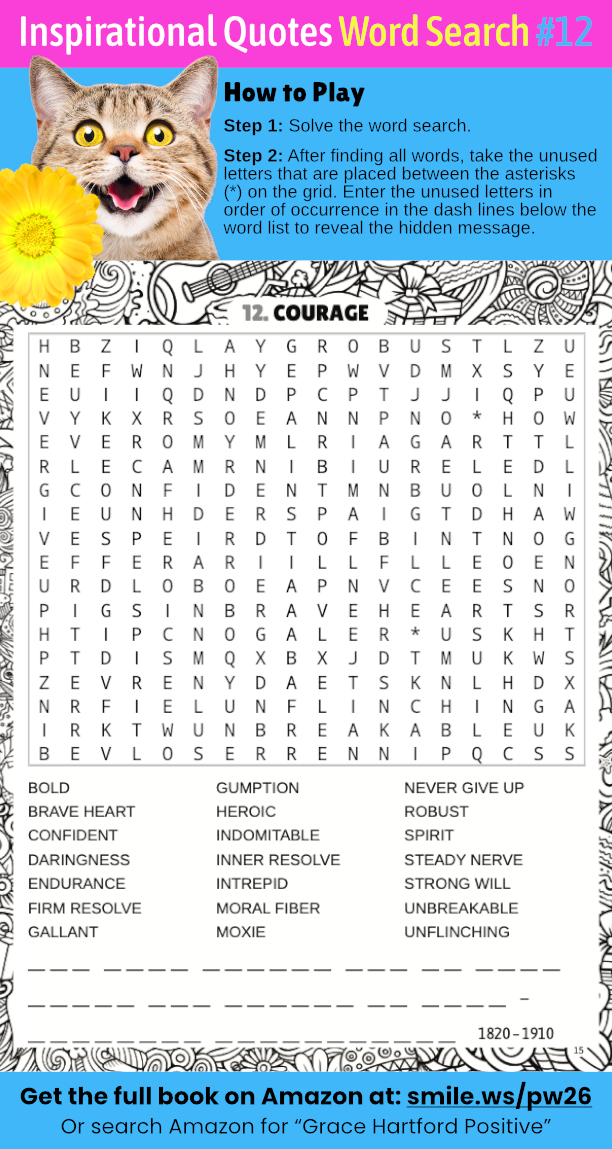 🛡️ Solve this Courage word search! Find words of bravery and reveal a hidden quote that ignites your inner strength. Stand tall. Search Amazon for “Grace Hartford Positive” for the full book. #WordSearch #Puzzle #Wellness #Resilience